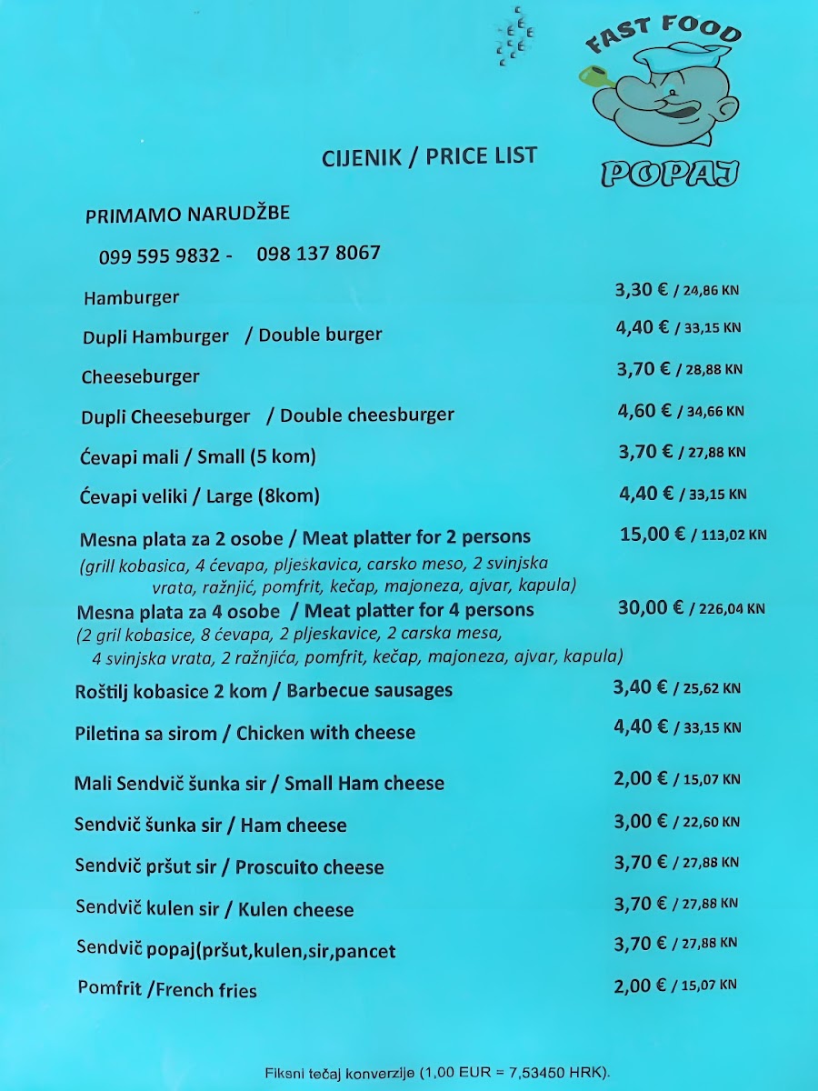 Welcome to Fast Food Popaj, a beloved fast food spot nestled in Cista Velika, Croatia. Here, a diverse and appetizing menu awaits you, featuring succulent burgers and flavorful cevape sandwiches that have captured the hearts of many travelers. For just €2, indulge in crispy French fries, a must-try for any diner.